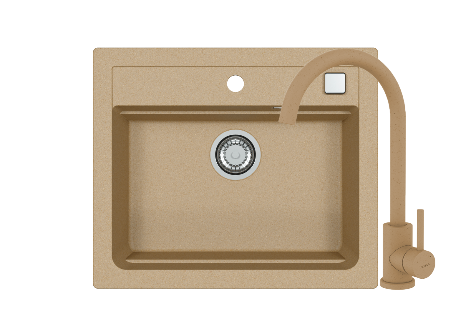 Acest model de chiuveta Alveus este incastrabil, conceput pentru montajul pe blatul de bucatarie, fiind parte continua a suprafetei de lucru. Intr-un decupaj apropiat ca si dimensiuni (57 x 48 cm), chiuveta se pozitioneaza pe blat din partea de sus si se fixeaza cu ajutorul clemelor furnizate.