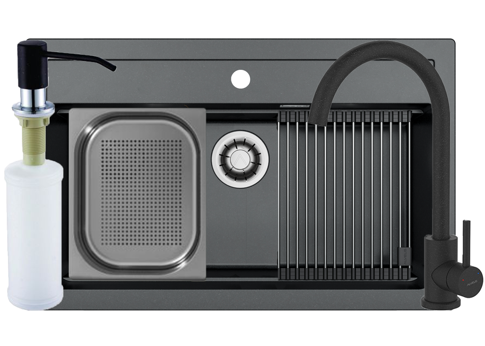 Dispozitiv detergent pentru chiuveta Alveus, cu o capacitate de 0.32 litri.